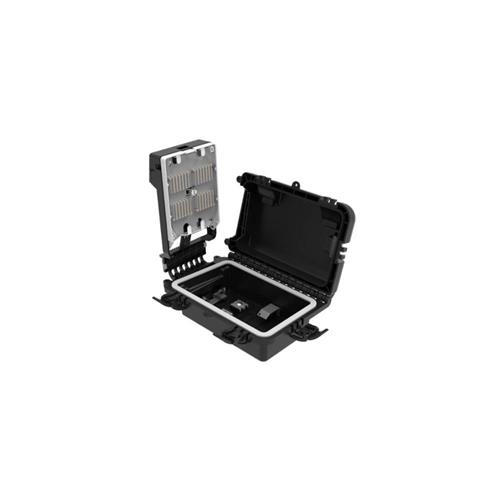 Base, tampa articulada com fechamento mecânico através de 3 presilhas plásticas, bandeja splitter, articuladores dos adaptadores, proteção dos articuladores, bandeja de sobra e fusão de fibras, ferramenta de inserção dos cabos drop.